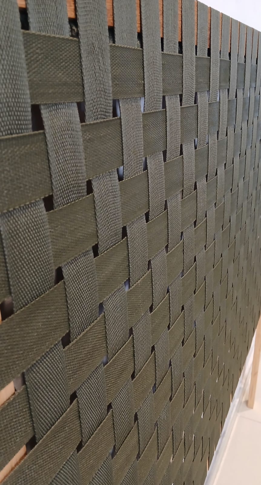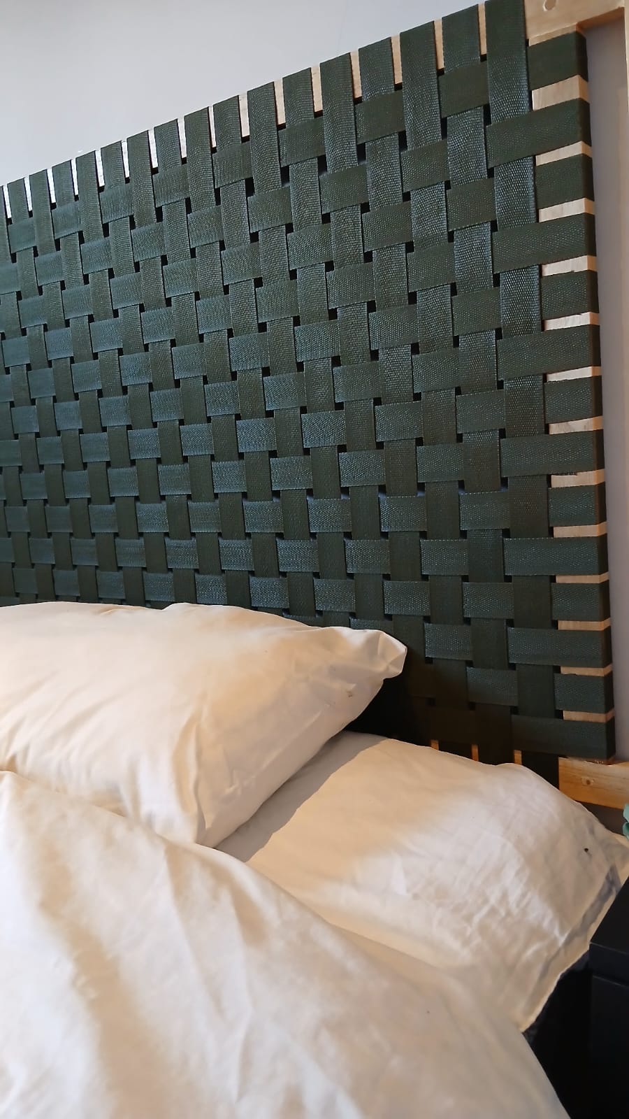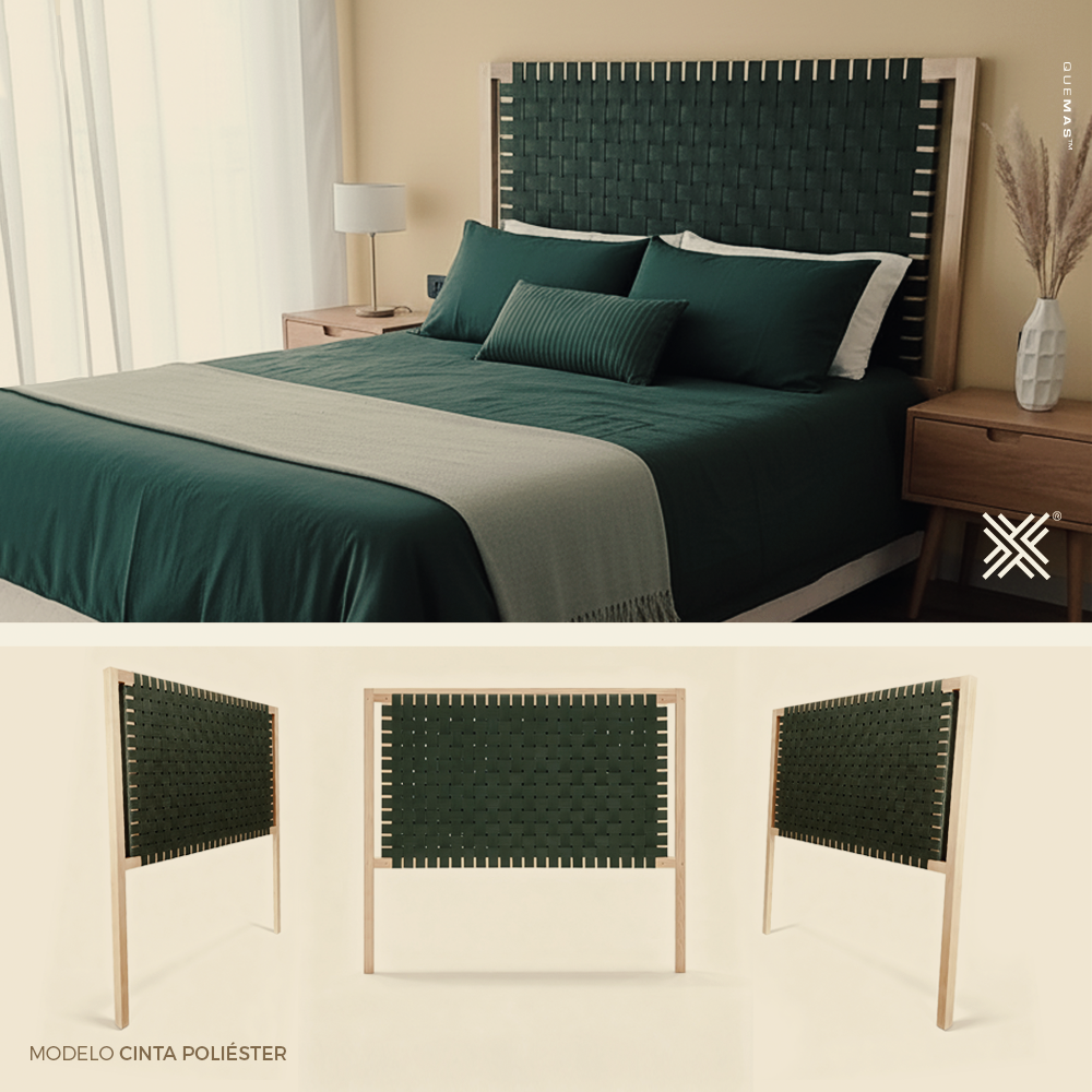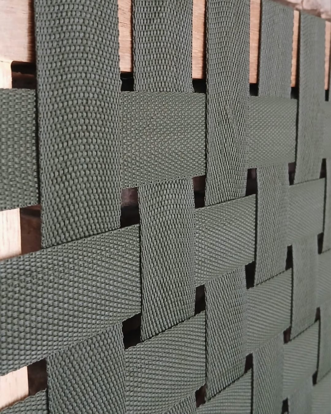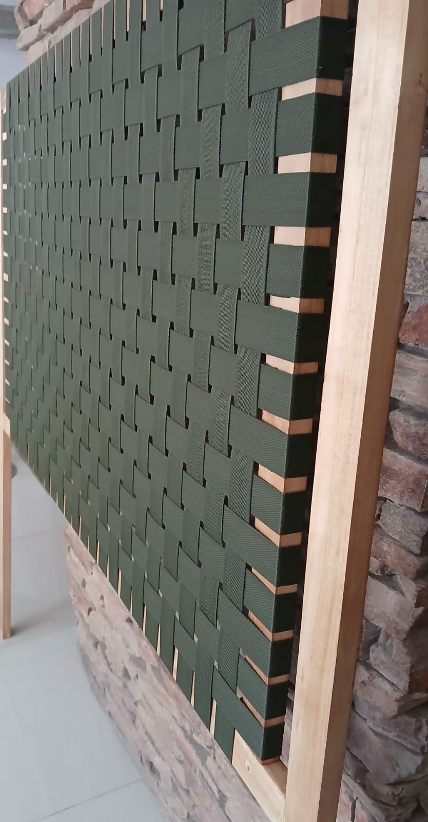 Respaldo de cama con doble parante vertical realizado en madera de Kiri con entramado de cintas de poliéster.